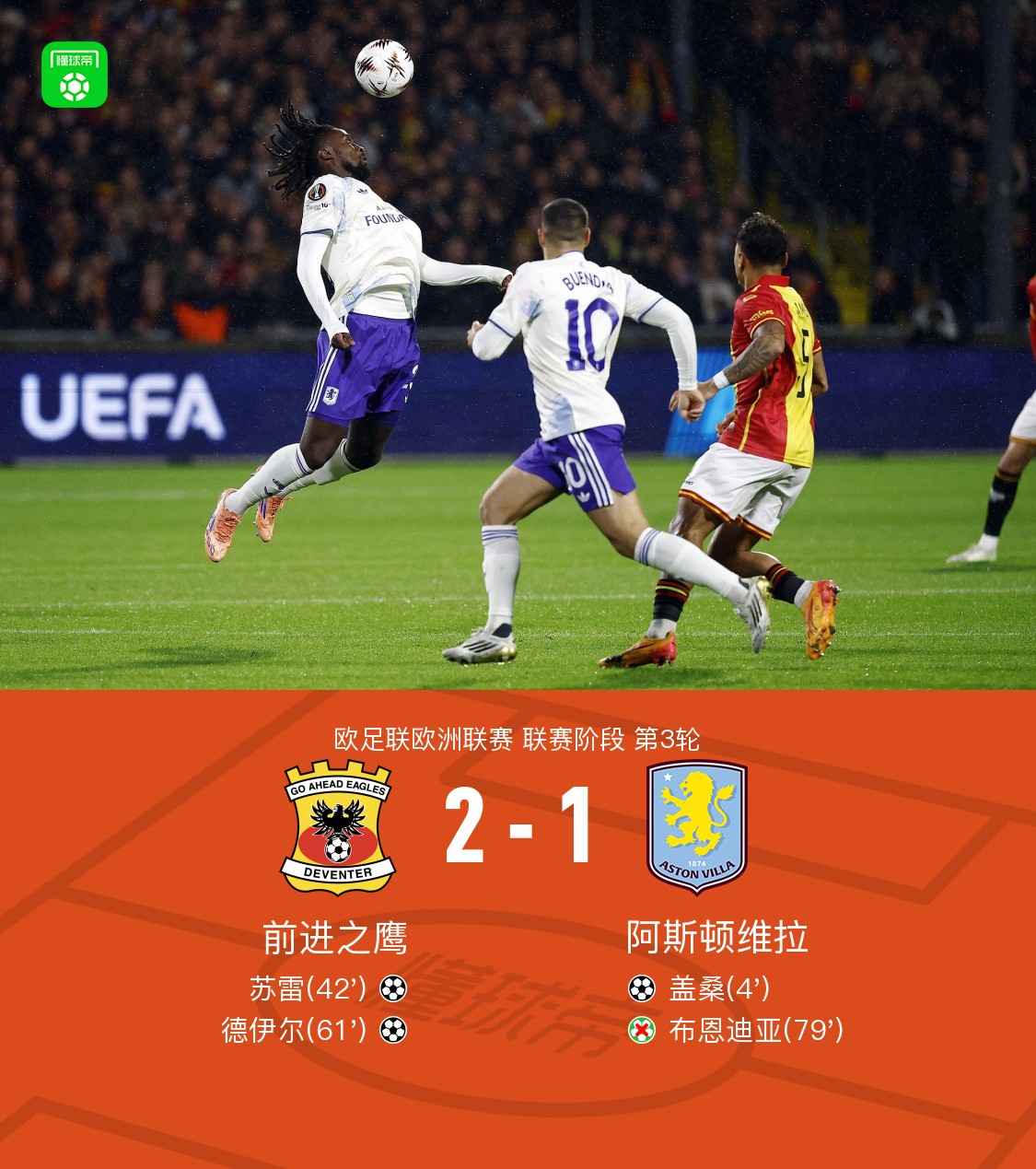 北京时间10月24号欧足联欧洲联赛联赛阶段第三轮,前进之鹰跟阿斯顿维拉干上了。上半场盖桑开场就闪击,半场快结束的时候特维特开出任意球,苏雷折射破门把比分扳平。下半场约里斯-克拉默助攻德伊尔破门反超比分,之后布恩迪亚把点球踢飞了。最后维拉客场1-2输给了前进之鹰。点这儿看这场比赛的详细数据>>点这儿看欧联的完整积分榜>>关键事件第4分钟,带球冲进去,盖桑开场就闪击,维拉1-0
